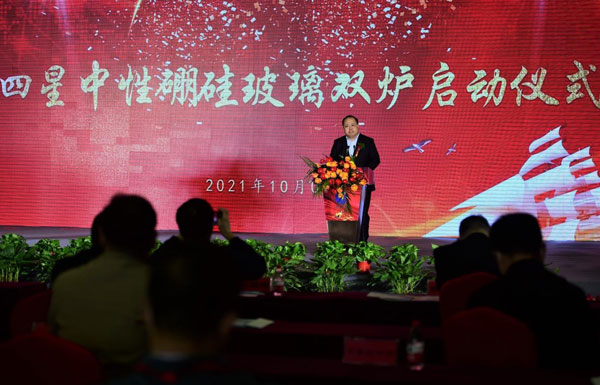 中國生化制藥工業協會常務副會長胡文言在致辭中講到,四星玻璃作為全球大規模生產中性硼硅玻璃能量產的企業少數幾家大概是三家四家企業之一,掌握了獨到的技術,是我們國家的幸運,是人民的需求。 2021年工信部已經確定了滄州四星玻璃是我們國家級的專精特新小巨人企業,四星玻璃為疫苗生產貢獻了數億支疫苗瓶,成為了民族脊梁,是防治新冠疫情的功臣,是我們的驕傲。滄州四星這個5號,6號窯爐雙爐啟動,也是解決眼門前的這個巨大的需求,為這個需求做出了重大的貢獻。